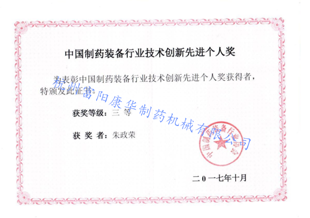 祝賀朱政榮董事長中國制藥裝備行業(yè)技術創(chuàng)新先進個人三等獎!